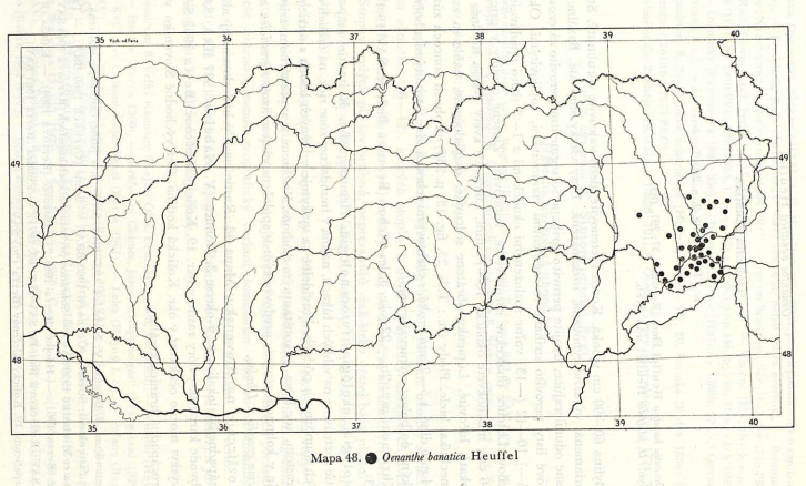 Na mape výskytu druhu Oenanthe banatica z renomovanej vedeckej publikácie z r. 1984 sa výskyt tohto druhu v našich „končinách“ ešte neuvádza. V súčasnosti sú Kolbasovské lúky zatiaľ jediná lokalita, z ktorej je tento druh z územia NP Poloniny známy. Zdroj mapy: Bertová L., a kol., 1984: Flóra Slovenska IV/1. Veda, vydavateľstvo SAV, str. 266.