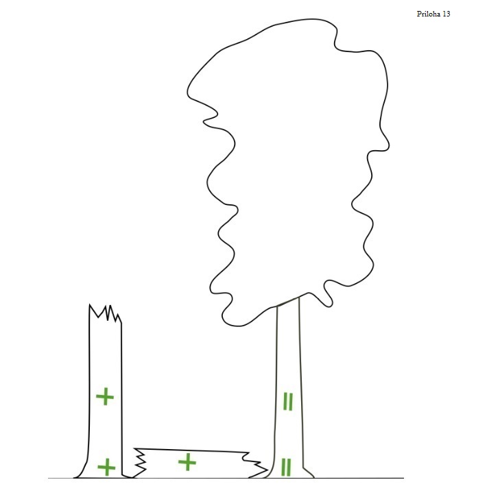 Spôsob značenia stromov na dožitie v porastoch – Príloha č. 13 Príručky pre prijímateľa štátnej pomoci v rámci OPKŽP „Zlepšovanie stavu druhov a biotopov európskeho významu v lesných ekosystémoch vybraných chránených území“. Kríž zelenej farby predstavuje terénne označenie ponechaného hrubého mŕtveho dreva, čo je tiež ďalšie osobitné opatrenie projektu OPKŽP, ktoré sa zatiaľ nerealizuje.