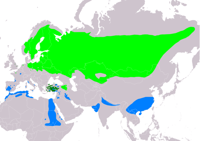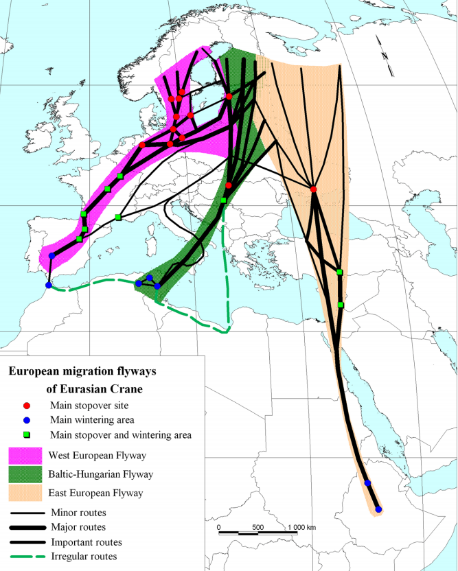 Mapa rozšírenia druhu žeriav popolavý (Grus grus) podľa IUCN verzia 2019.1 : Autor: SanoAK: Alexander Kürthy – Made with Natural Earth. Free vetor and raster map data @ naturalearthdata.com. Range map from BirdLife International 2016. Grus grus. The IUCN Red List of Threatened Species 2016: e.T22692146A86219168. https://dx.doi.org/10.2305/IUCN.UK.2016-3.RLTS.T22692146A86219168.en. Downloaded on 14 June 2019 as visual indicator of distribution., CC BY-SA 4.0, https://commons.wikimedia.org/w/index.php?curid=79700107